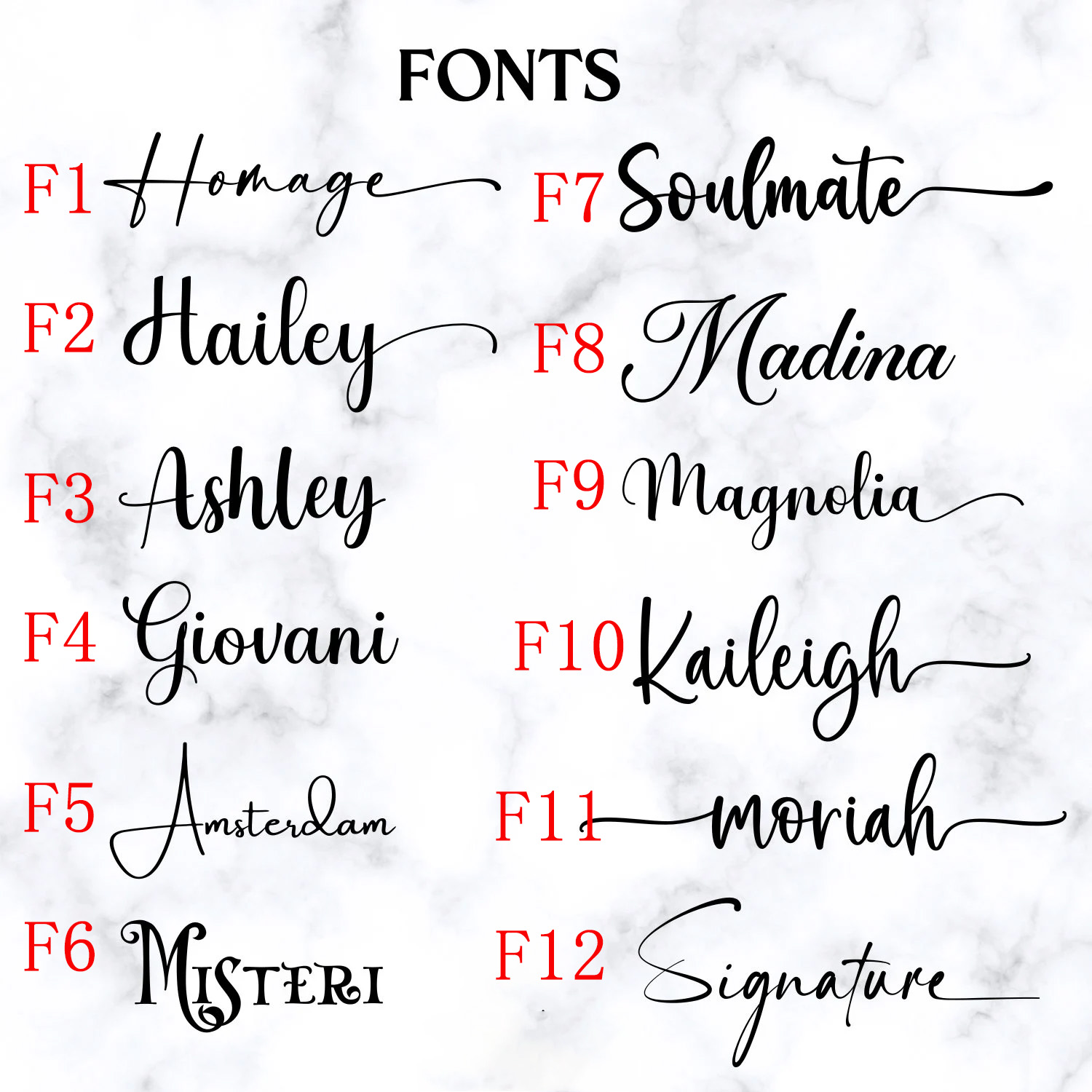 Available in 12 fonts. The font pictured is Madina. If your preferred font is not listed, please let us know. We can customize it to your preferences. Vinyl colors are also available in light pink and pink. The journal pictured is pink. Check out our other journal listings for other designs. Please contact us for any requests.
